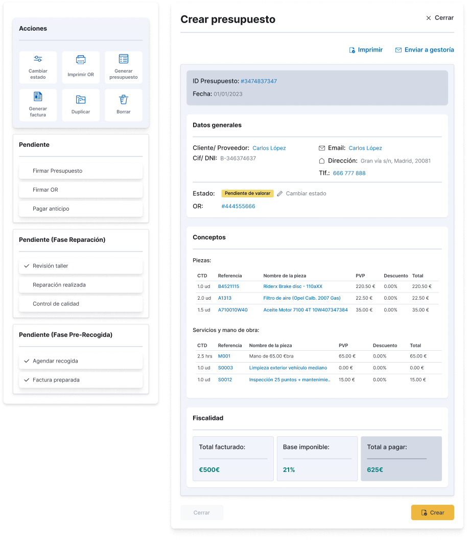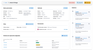 La estructura por bloques en esta vista proporciona una visión completa de el estado en pasos de la OR, así como los datos del cliente y del vehículo, con acciones relacionadas como imprimir y generar presupuestos.