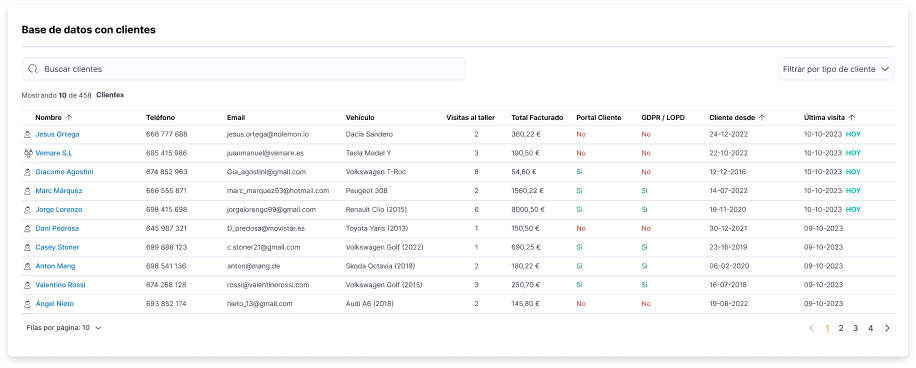 Ofrecemos un listado completo que incluye datos importantes como total facturado, antigüedad, última visita y acceso al portal del cliente.