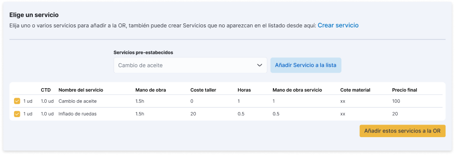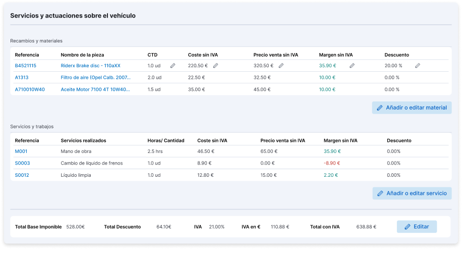 Ofrecemos un listado detallado de piezas y elementos de mano de obra facturables, acompañado de un histórico completo desde la solicitud de cita hasta la facturación. Esta vista ha sido sometida a pruebas con usuarios reales en sesiones discovery, recibiendo un feedback muy positivo.