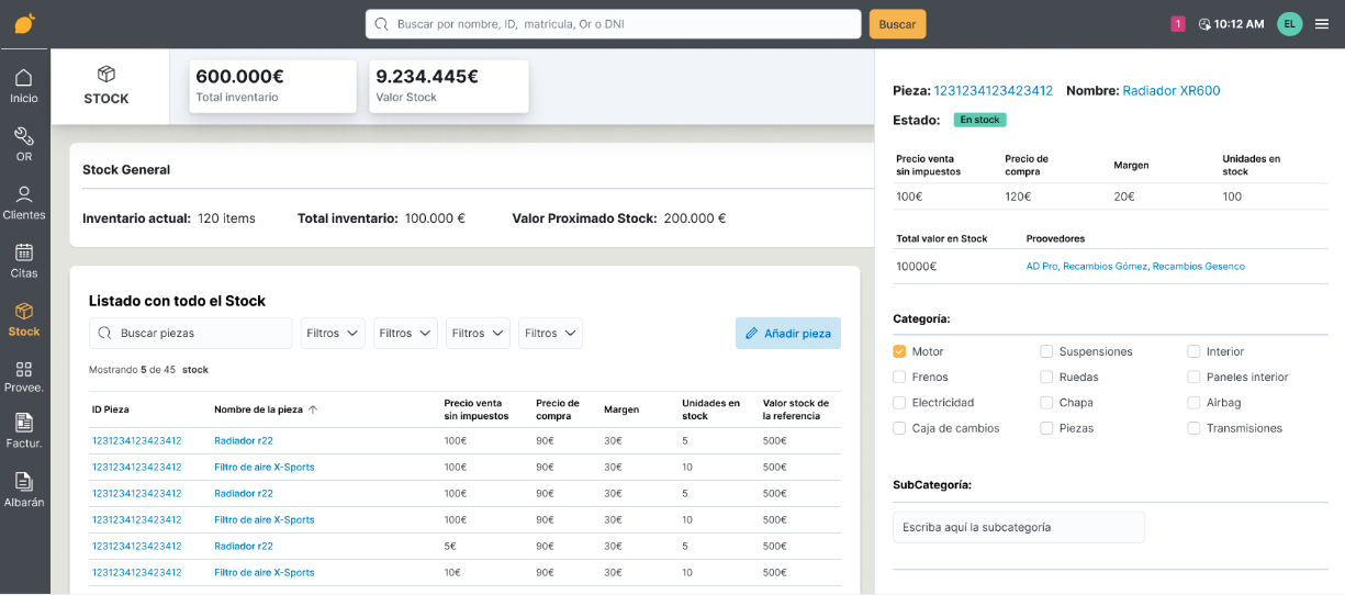 Se ve el listado general de las piezas con nombre/ID, el estado de la referencia («En stock», «Sin Stock» o «Pedido»), unidades, precio (venta/compra/valor en stock), margen, categoría y subcategoría.